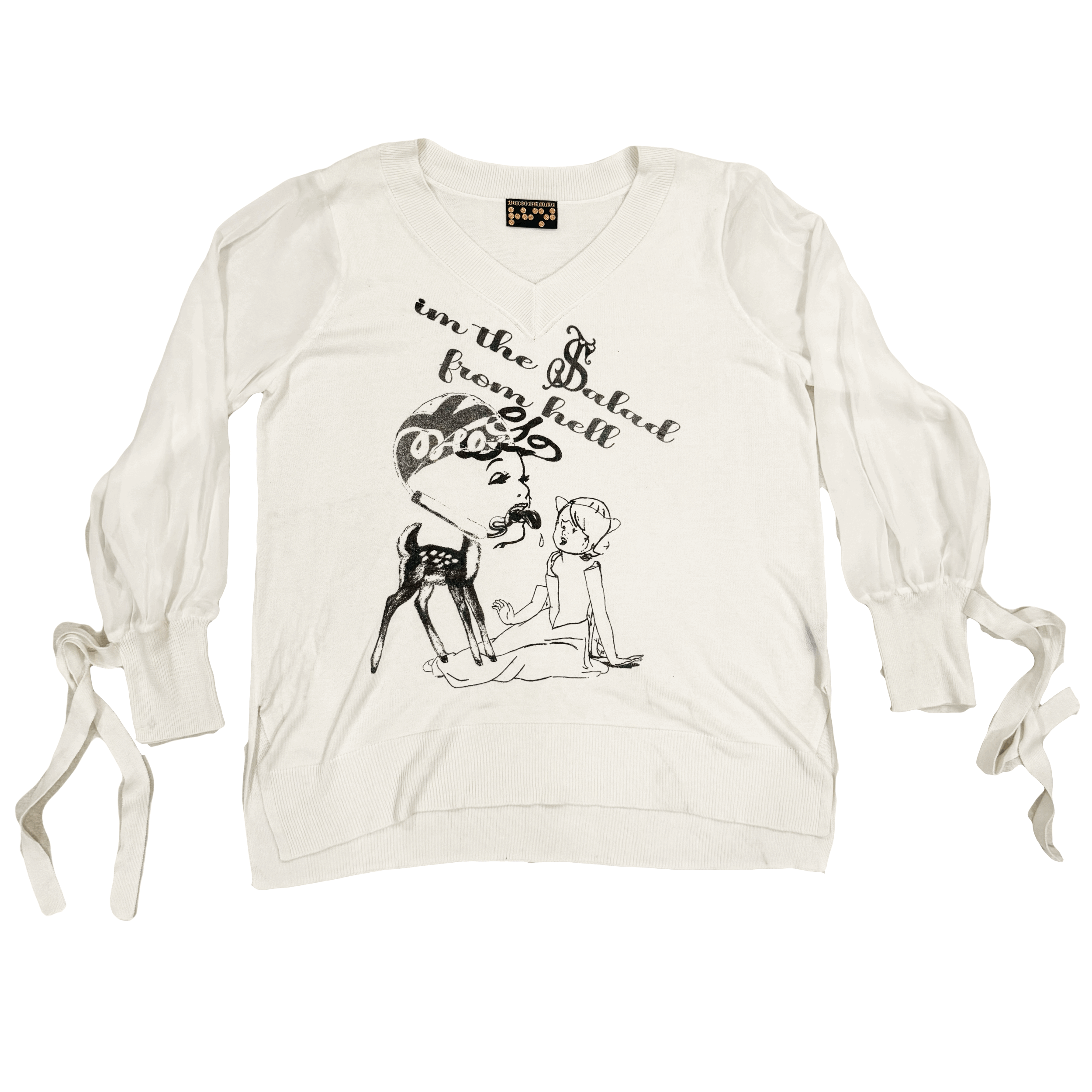 Blah Blah › Im The Salad From Hell Sweater Image 1 of 1 Im The Salad From Hell Sweater $185.00 sold out L Vintage White V Neck Sweater With Mesh Sleeves And ties1 of 1 Sold Out Added! L Vintage White V Neck Sweater With Mesh Sleeves And ties1 of 1